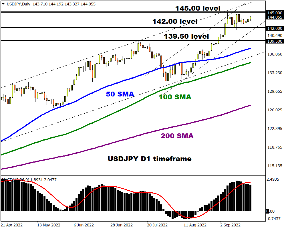 Over the past few days, the USDJPY has been trapped within a 300-pip range with support at 142.00 and resistance at 145.00. The trend is bullish with prices trading above the 50, 100, and 200 SMA. A solid breakout above 145.00 could inspire a move towards 146.00 and higher. If prices sink back towards 142.00, we can see the USDJPY challenge at 139.50.