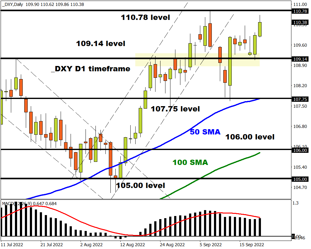 Heightened geopolitical tensions injected dollar bulls with fresh inspiration this morning. A hawkish Federal Reserve could feed the beast, pushing the Dollar Index (DXY) beyond 110.78 before the end of today! Such a development could encourage a further incline towards 111.00 and 112.50, respectively. A move back below 109.14 may result in a selloff back to 107.75.
