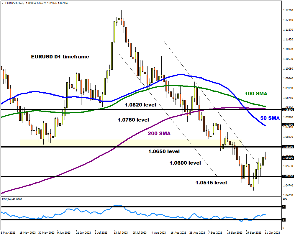 Euro bulls could make a comeback after prices secured a daily close above the 1.0600 level. Although prices are trading below the 50, 100, and 200-day SMA, the bearish trend may be threatened if a solid breakout above 1.0650 is achieved. This may open a path higher toward the 50-day SMA at 1.0750 and 1.0820 – where the 200-day SMA resides. Should prices keep below 1.0600, this could trigger a decline back towards 1.0500.