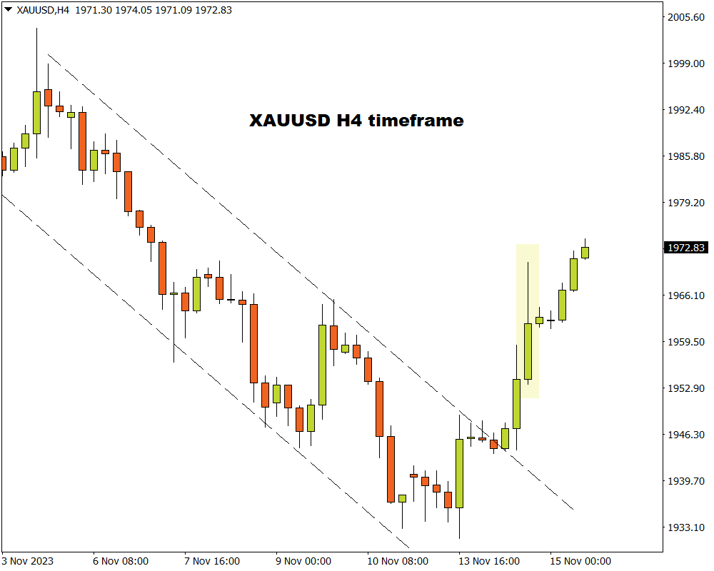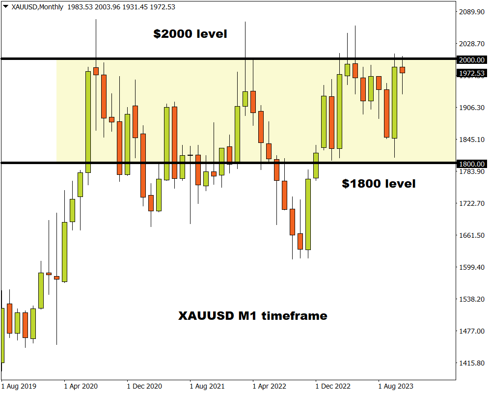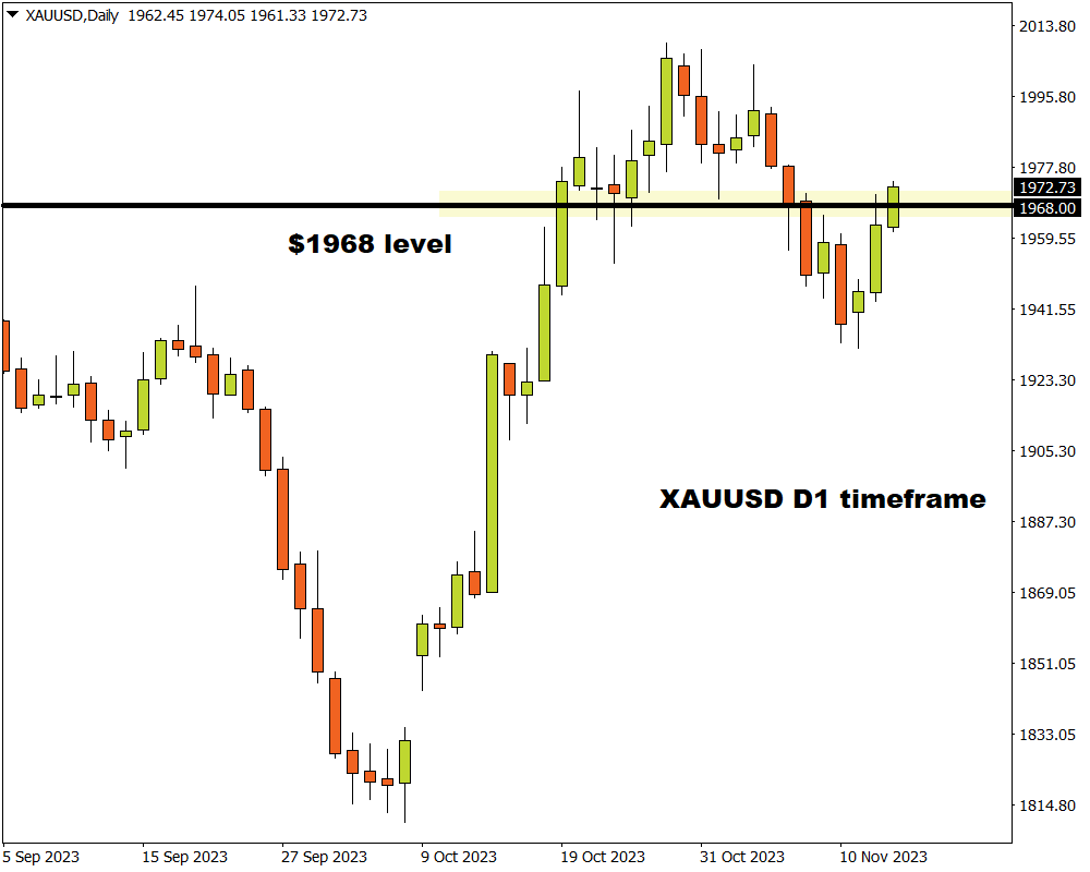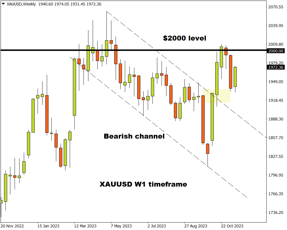 Taking a brief look at the monthly timeframe, prices remain in a very wide range with key resistance at $2000 and support at $1800. It is worth noting that gold has never secured a monthly close above the psychological $2000 level. Given the solid monthly candle in October and strong fundamental drivers supporting bulls, a significant move could be on the horizon.