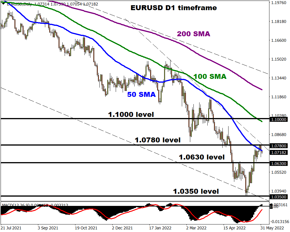 Taking a look at the daily timeframe, the EURUSD could be experiencing a technical bounce. While prices could push higher towards 1.1000 and beyond, the key level to watch out for is 1.0780. Sustained weakness below this point could encourage a decline back towards 1.0630 and 1.0350.