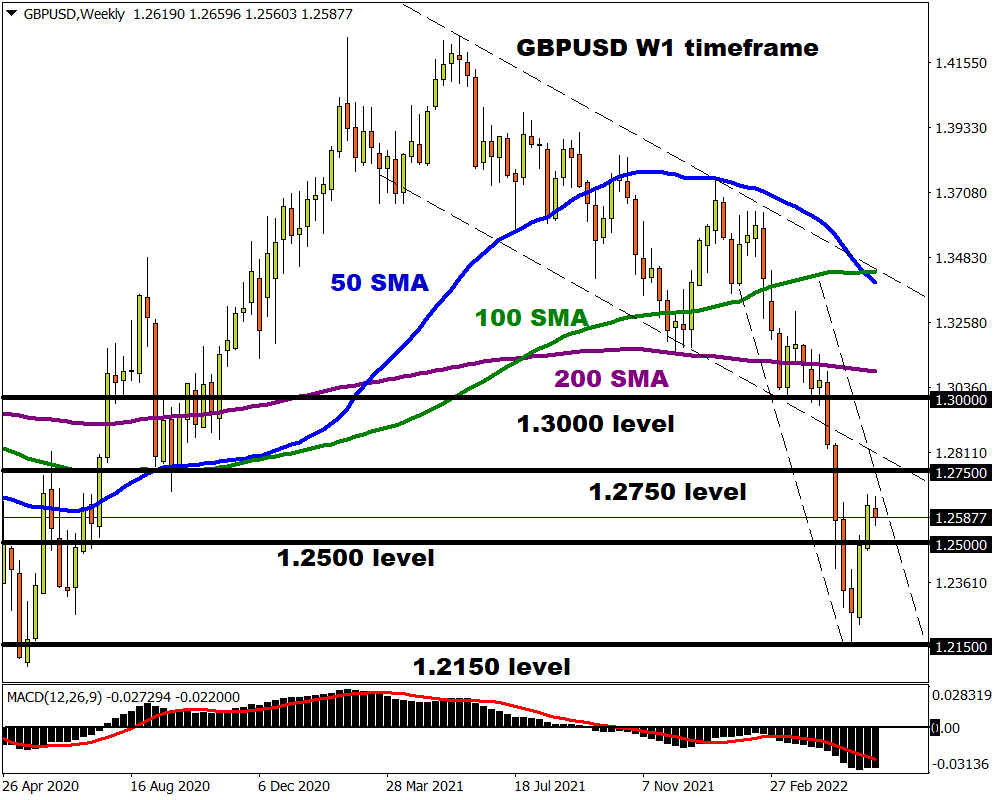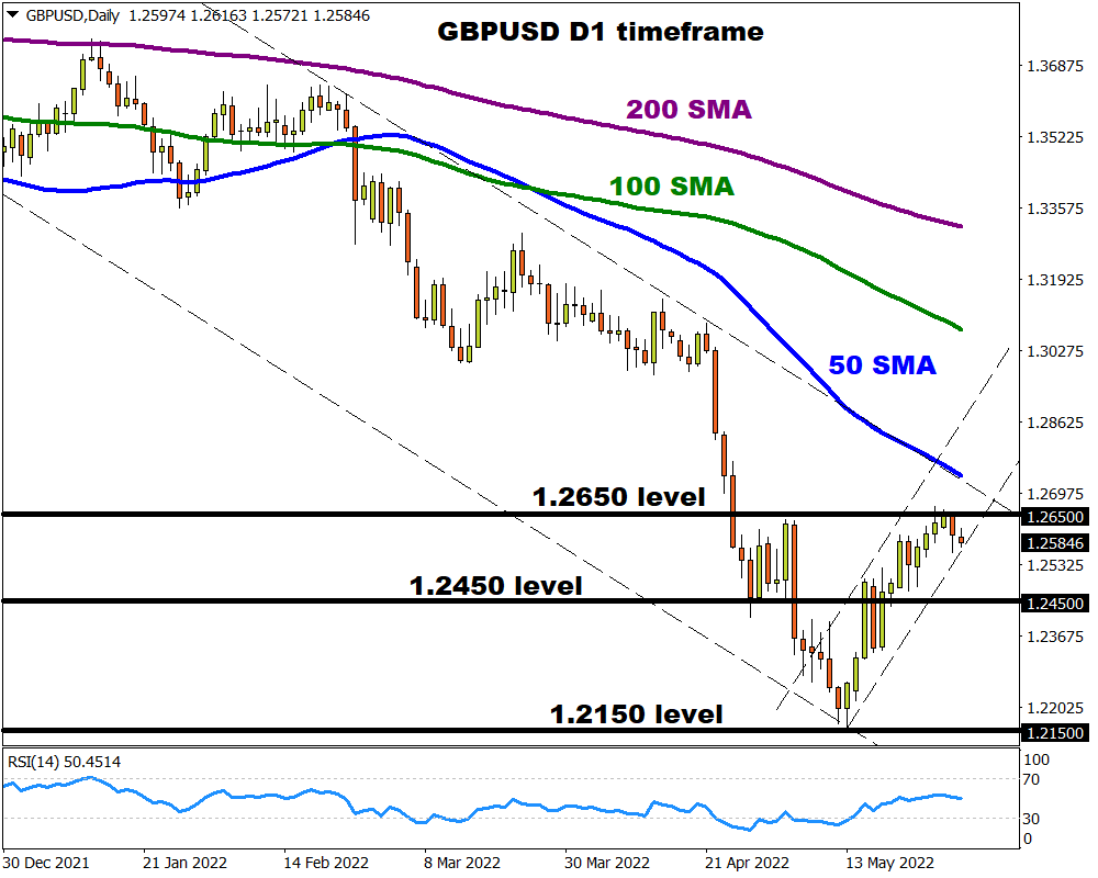 On the daily charts, prices seem to be in a bullish channel with resistance found at 1.2650. It looks like the currency pair could be experiencing a technical rebound with a breakout above 1.2650 opening a path to higher levels. If this level proves to be reliable resistance, we could see a decline towards 1.2450 which may open the doors back to 1.2150.