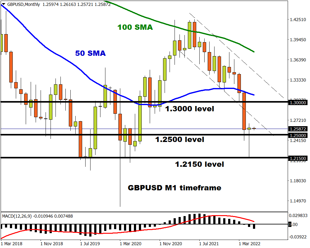 The GBPUSD remains under pressure on the monthly timeframe. A strong below close under 1.2500 may open the doors towards 1.2150.