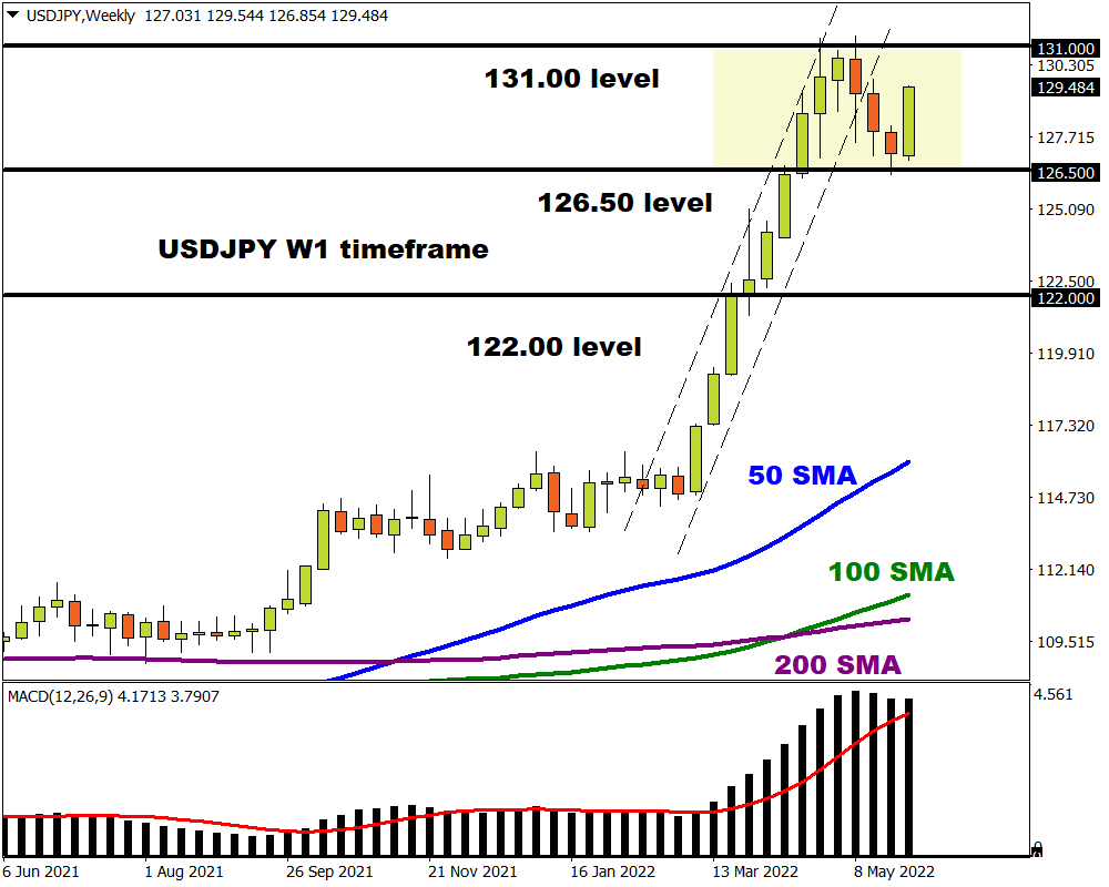 After rebounding from the 126.50 region, the USDJPY could be heading for fresh multi-decade highs beyond 131.00. Prices remain in a bullish trend on the monthly timeframe as there have been consistently higher highs and higher lows. The first key point of interest is at 131.00.
