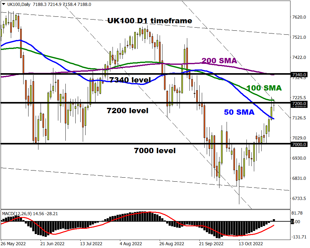 Since punching above the 7200-resistance level, prices have struggled to push higher as the 100-day Simple Moving Average offered another line of resistance. Although the FTSE100 has staged a rebound from the 6705 regions, prices still remain in a bearish channel. Should 7200 prove to be a tough nut to crack for bulls, prices could sink back towards 7000. Alternatively, a strong breakout above 7200 may open the doors towards 7340 – a level where the 200-day SMA resides.