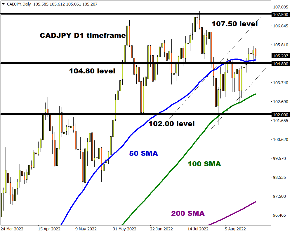 We could see the CADJPY push higher if 104.80 proves to be reliable support. If prices use this level to push higher, the next key level of interest can be found at 107.50. A selloff below 104.800 could open the doors back towards the 100-day SMA and 102.00, respectively.