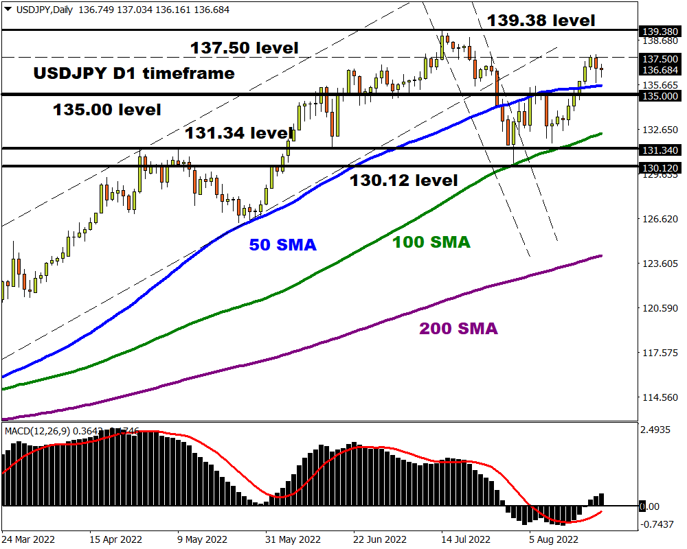 The USDJPY is bullish on the daily charts. Prices are trading above the 50, 100, and 200-day Simple Moving Average while the MACD trades above zero. A solid break above 137.50 could trigger a move towards 139.38. Under 135.00, prices are seen testing 131.34.