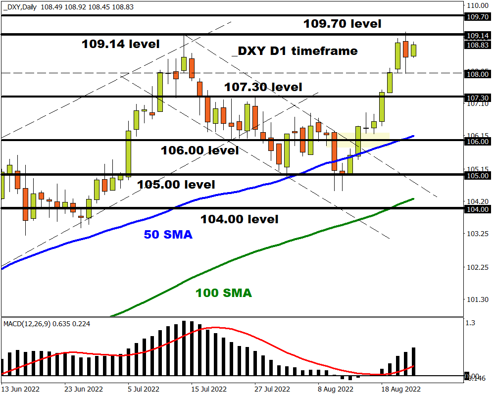 European stocks were mixed, the dollar stabilised while gold prices wobbled above $1740 ahead of Federal Reserve Powell’s speech on Friday. The central bank head is expected to strike a hawkish note which may reinforce aggressive rate hike bets – ultimately boosting the dollar. In the event of an unexpected ‘dovish’ Fed pivot, the dollar could be dealt a heavy blow.