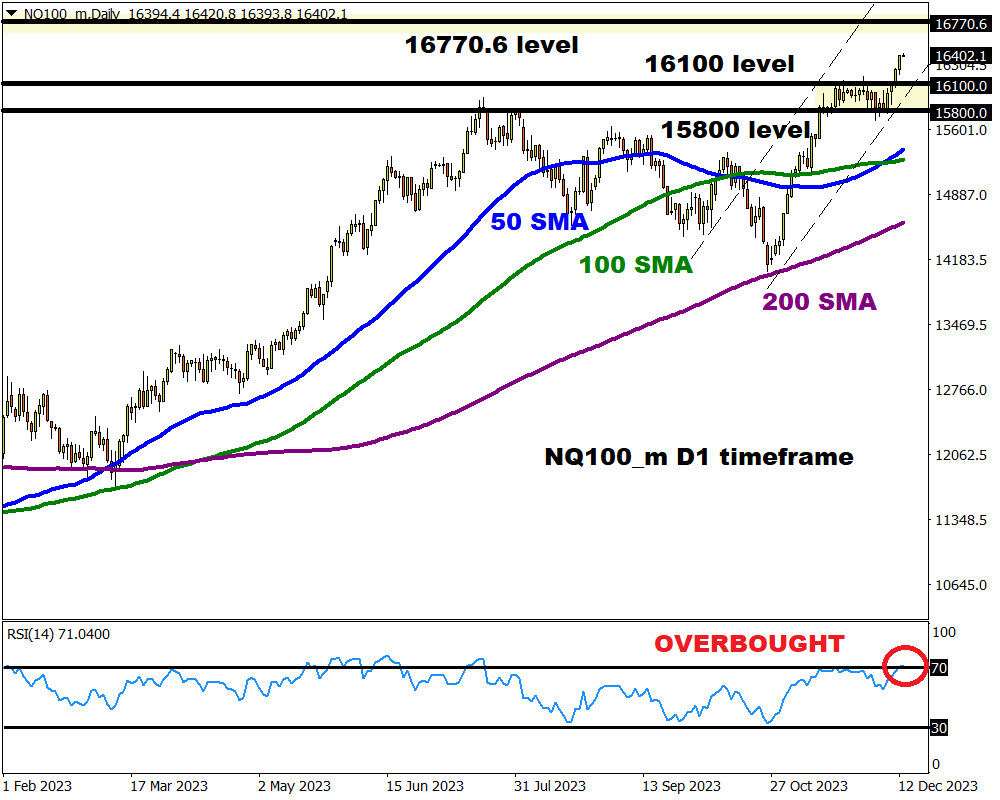 The NQ100_m jumped to a fresh 2023 high in the previous session after signs of slowing inflation supported hopes around the Fed cutting interest rates next year.