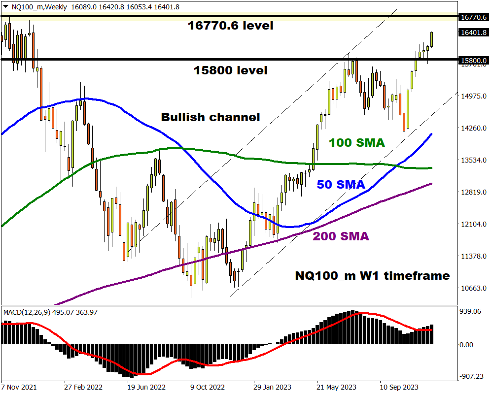 The NQ100_m is respecting a bullish channel on the weekly charts with the next key level at the all-time high of 16770.6 created back in November 2021.