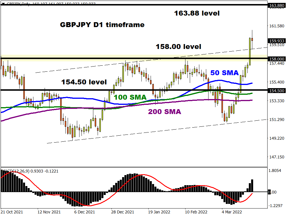 Bulls are certainly in the building when looking at the GBPJPY. There have been consistently higher highs and higher lows while prices are trading above the 50, 100 and 200 Simple Moving Average. The upside momentum looks healthy with the breakout above 158.00 paving a path towards levels not seen since mid-2016 at 163.88. Should bulls lose control of the steering wheel and prices decline back towards 158.00, this could trigger a deeper selloff to 156.00 and 154.50, respectively.