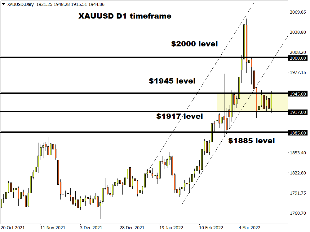Gold remains trapped within a range with support at $1917 and resistance at $1945. It looks like the precious metal is gearing for a breakout above $1945 with the next key level of interest at $2000. Alternatively, a decline back below $1917 may open the doors towards $1885.