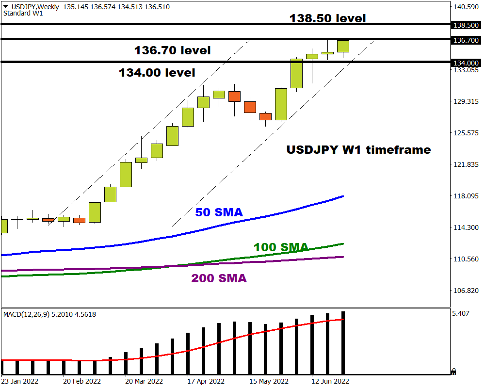 Zooming out to the weekly charts, the USDJPY seems to be gearing up for another breakout. A strong push above 136.70 could trigger an incline towards 138.00.