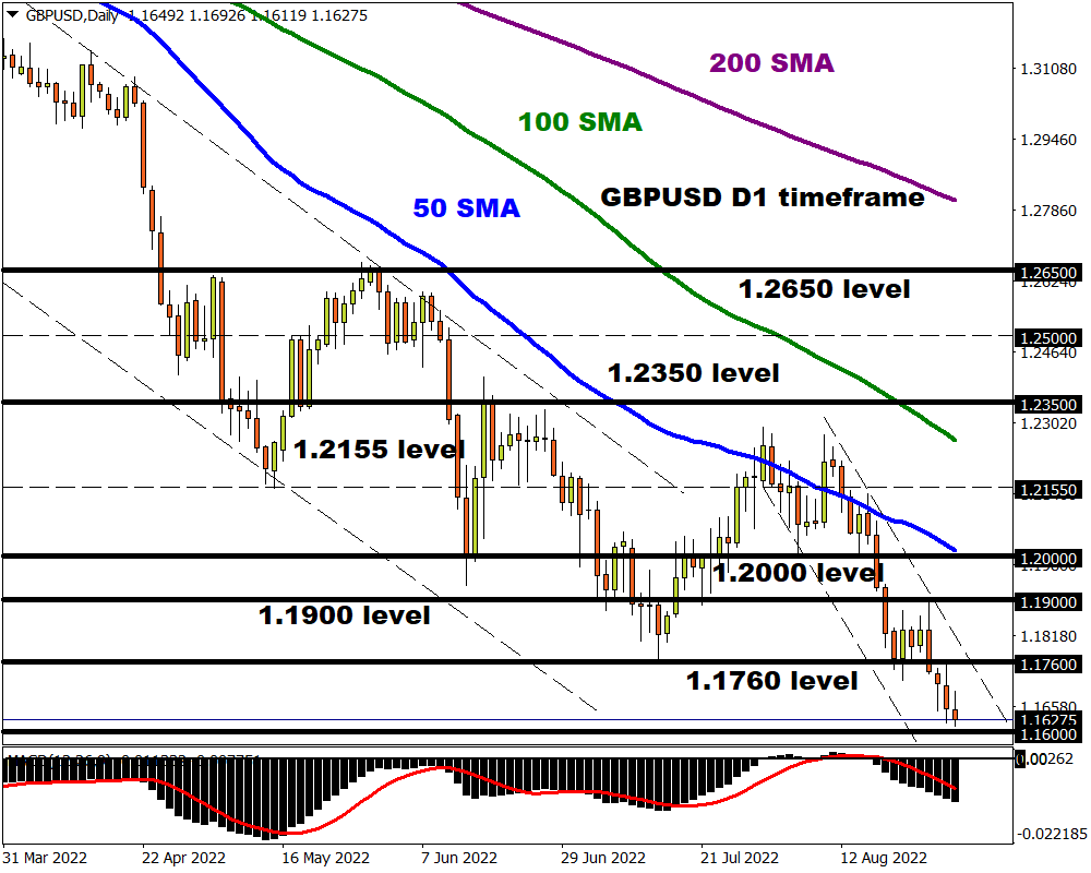 An appreciating dollar continues to drag the GBPUSD lower. A strong break below 1.1600 may result in a decline towards 1.1500. If 1.1600 proves to be reliable support, prices could retest 1.17600.