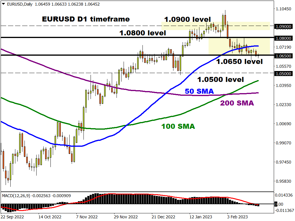 The EURUSD could be on the brink of a breakdown as prices wobble above the 1.0650 support. A solid break below this level could open the doors towards 1.0500. Should 1.0650 prove to be reliable support, a rebound back toward 1.0800 could be on the cards.