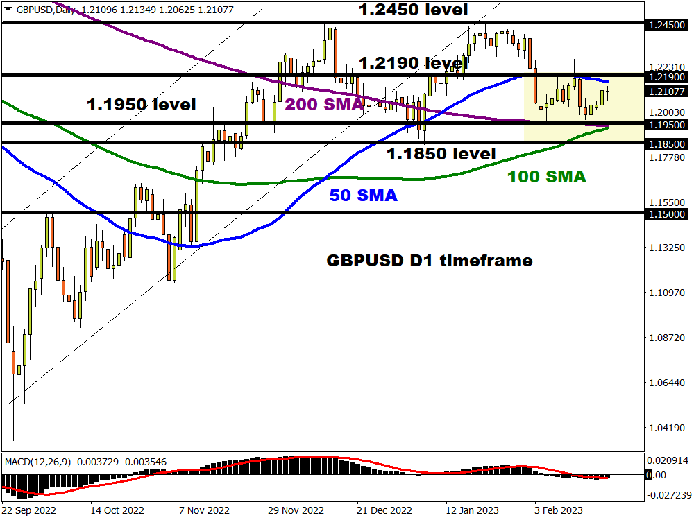 Nothing much has changed on the GBPUSD with support at 1.1950 and resistance at 1.2190. Given how prices experienced a sharp bounce from the 200-day SMA at 1.1950, the next key level of interest can be found at 1.2190. A breakout above this point may open a path toward 1.2450.