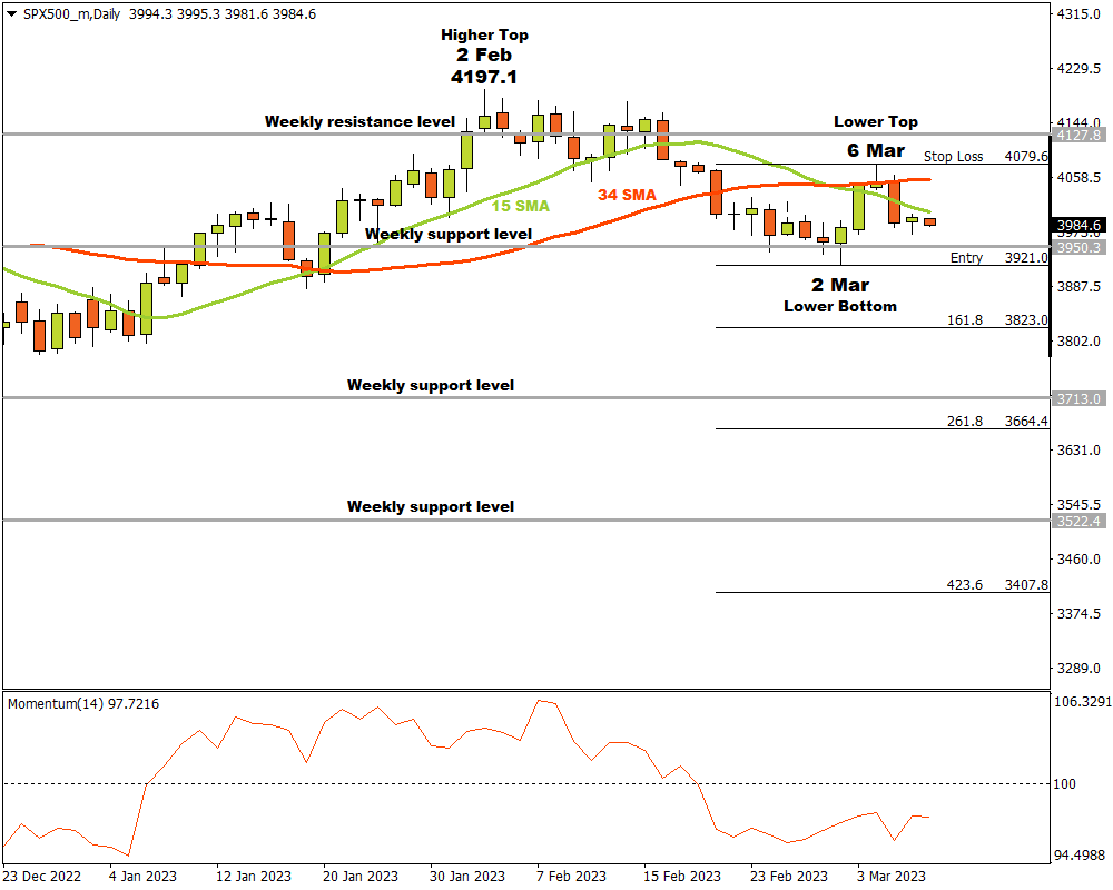 A possible critical support level formed when the price reached a weekly support level and a lower bottom was recorded on 2 March at 3921.0. The bulls drove the price higher but their momentum waivered and a lower top formed on 6 March at 4079.6.