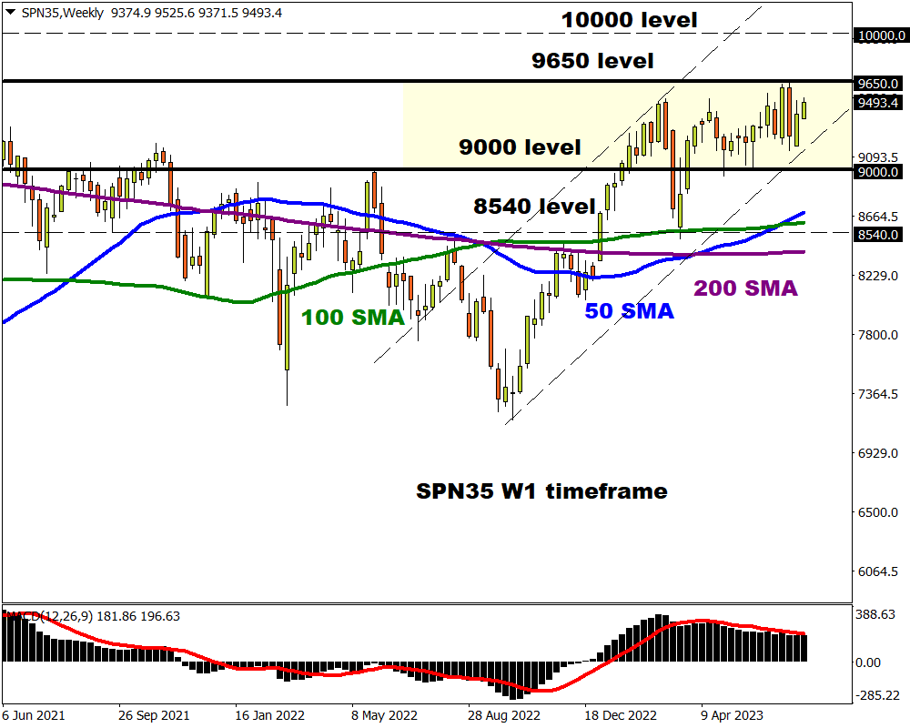 Taking a deeper dive into the technicals, the SPN35 remains in a wide range on the weekly charts with support at 9000 and resistance at 9650. A breakout could be on the horizon, but this is likely to be heavily influenced by Sunday’s election result.