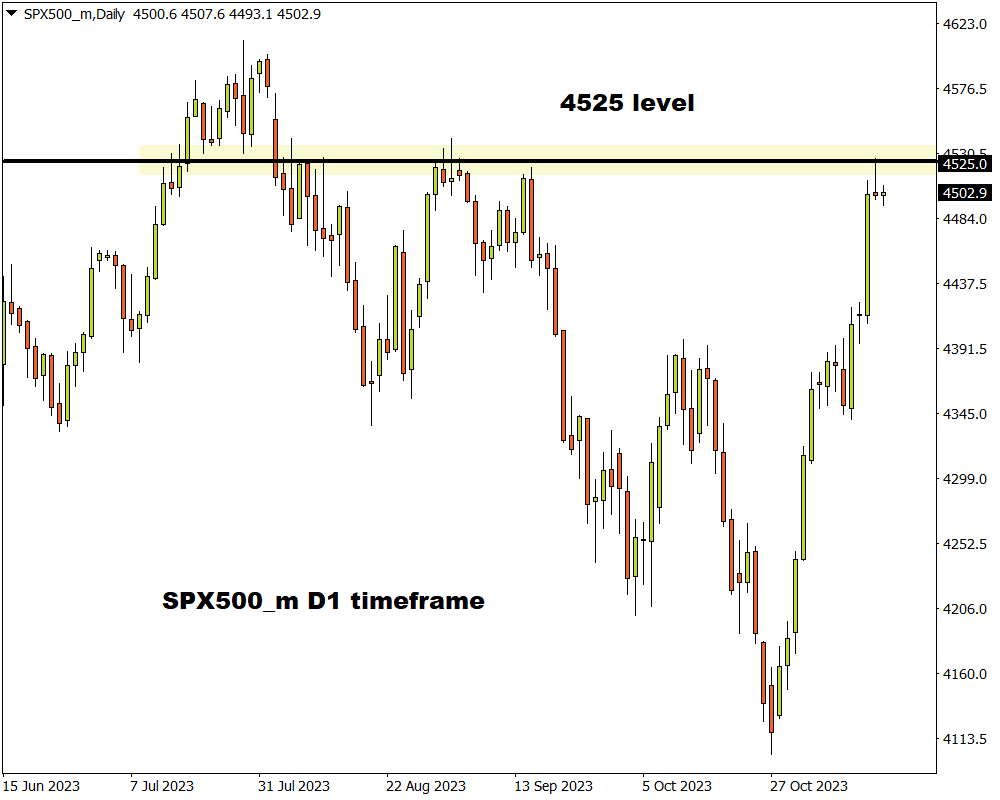 Looking at the daily timeframe, bulls have been on a roll over the past few days with the SPX500_m rallying over 7% since the start of November. However, bulls are currently eyeing a significant resistance level at 4525.