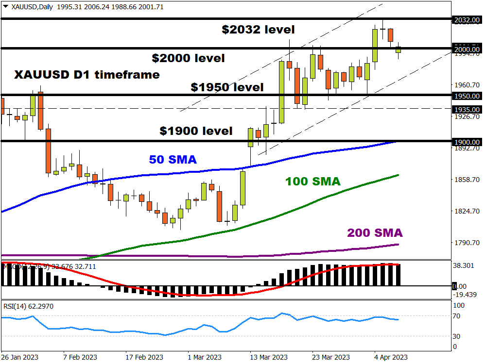Inflation in the United States is projected to slow 5.2% in March year-on-year compared to the 6% figure witnessed in February. If expectations match reality, this will mark the ninth consecutive decline in inflation. However, all eyes will be on the Core CPI readings which exclude more volatile items such as food and energy. Core inflation year-on-year is expected to rise 5.6% in March compared to 5.5% in the previous month. Ultimately, persistent signs of easing inflationary pressures in the world’s largest economy may fuel speculation around the Fed pausing rate hikes sooner than expected. This could boost appetite for zero-yielding gold, pushing prices back towards $2032 and beyond.