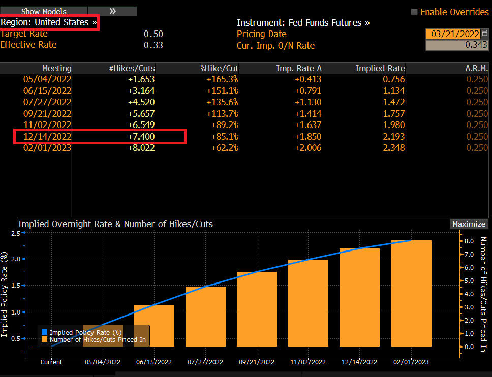 According to Bloomberg’s world interest rate probability model, markets have priced in 7 rates hikes this year.