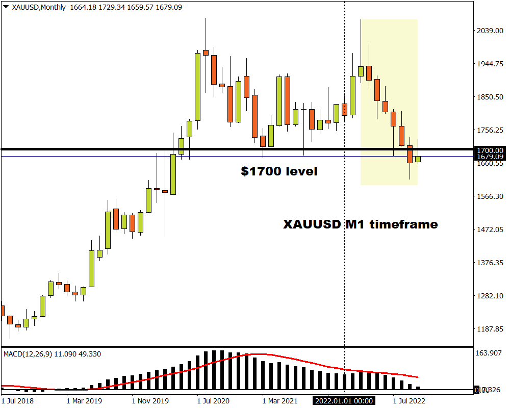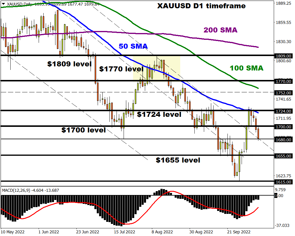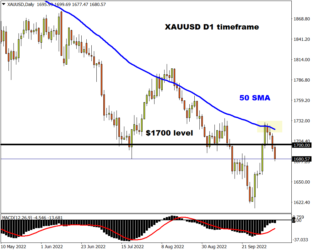 After briefly punching above the 50-day Simple Moving Average early last week, bears hijacked the driving seat as multiple fundamental forces dimmed the metal’s allure. Despite gaining over 1% since the start of October, prices are back below the psychological $1700 level with the path of least resistance pointing south.