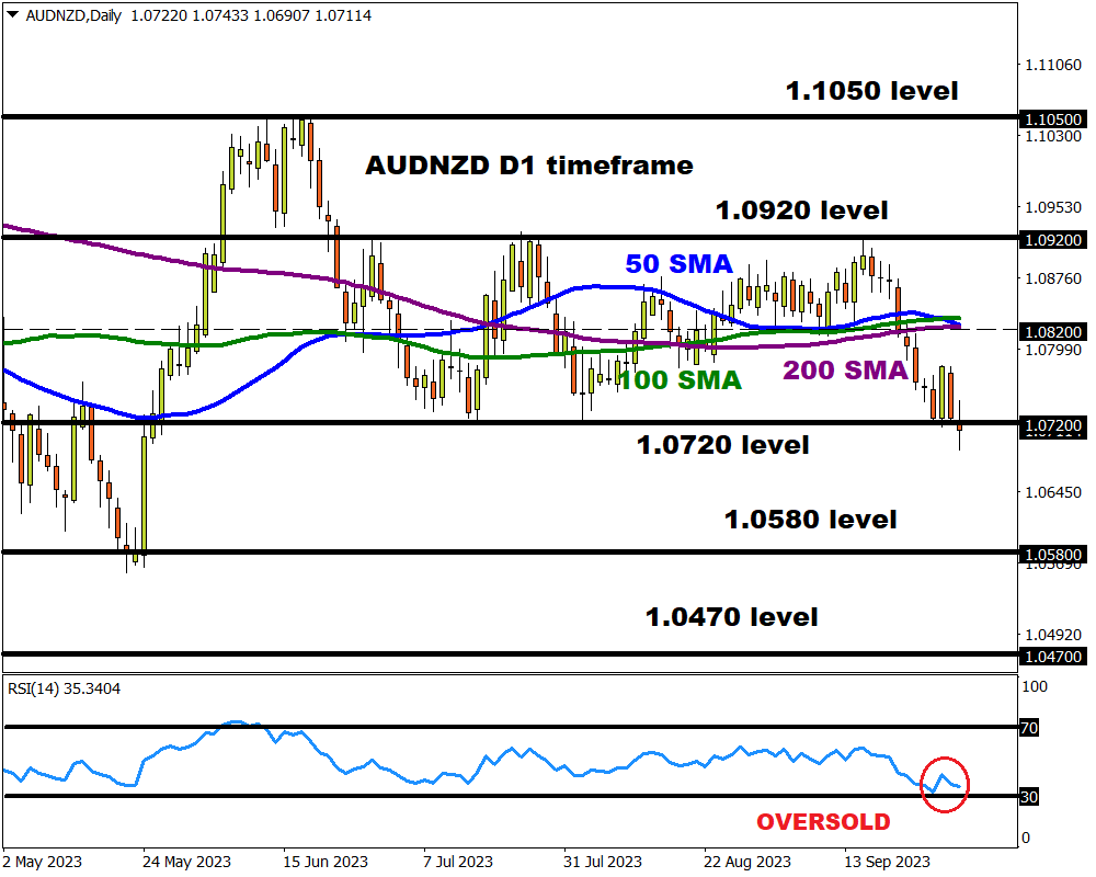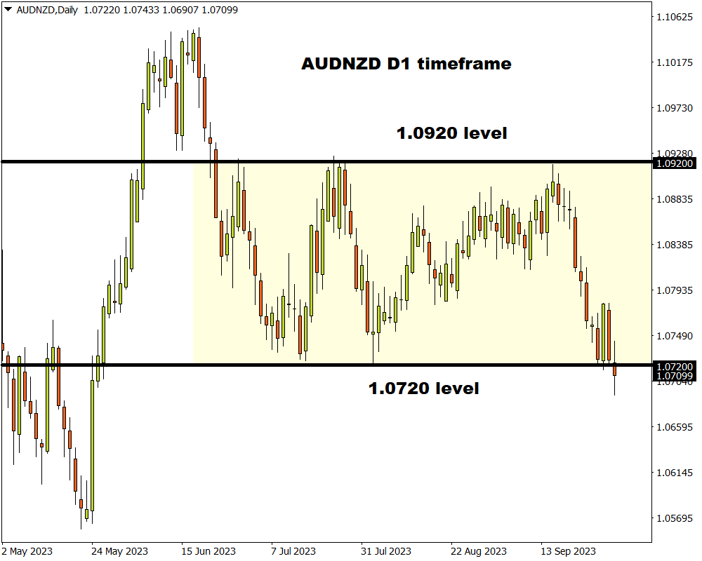 Since late June 2023, the currency pair has been trapped within a wide range on the daily charts with support around 1.0720 and resistance at 1.0920. However, the breakdown below key support this morning could be an early indication that a significant move may be on the horizon.