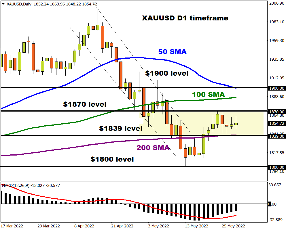 After experiencing wild rollercoaster swings in May, the precious metal could kick off June with a bang. Gold remains pulled and tugged by various forces ranging from a weaker dollar, Fed hike expectations, Treasury yields, inflation jitters, recessions fears, and heightened geopolitical risks. The fundamentals can be reflected in the choppy price action and periods of calm as bulls and bears bump heads. Prices are trading around $1856 as of writing which is below last week’s high. The key question is whether the current move is a technical bounce to higher levels of another ‘dead cat bounce’.