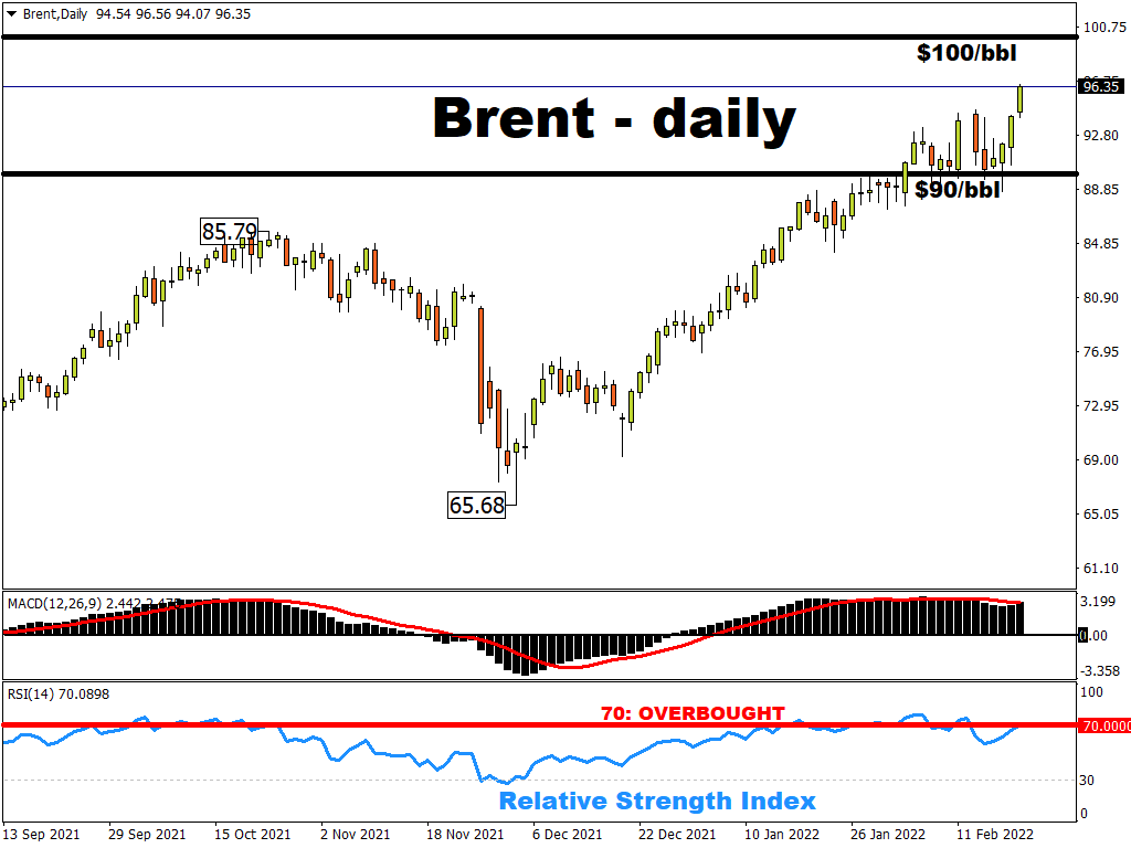 It's important to also note that the world’s most important oil price, Dated Brent (which measures the prices of actual barrels of oil – as opposed to just tradable on-paper contracts - bought and sold in the North Sea), had already broken above the $100 level last week. This is the price that traders are willing to pay to get their hands on physical barrels of oil right now, before they potentially become harder to get due to an escalation in the Ukraine crisis.