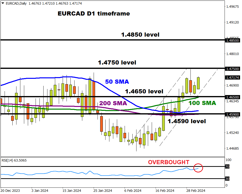 - A dovish sounding ECB that confirms potential rate cuts later this year is likely to weaken the euro, dragging the EURCAD lower.