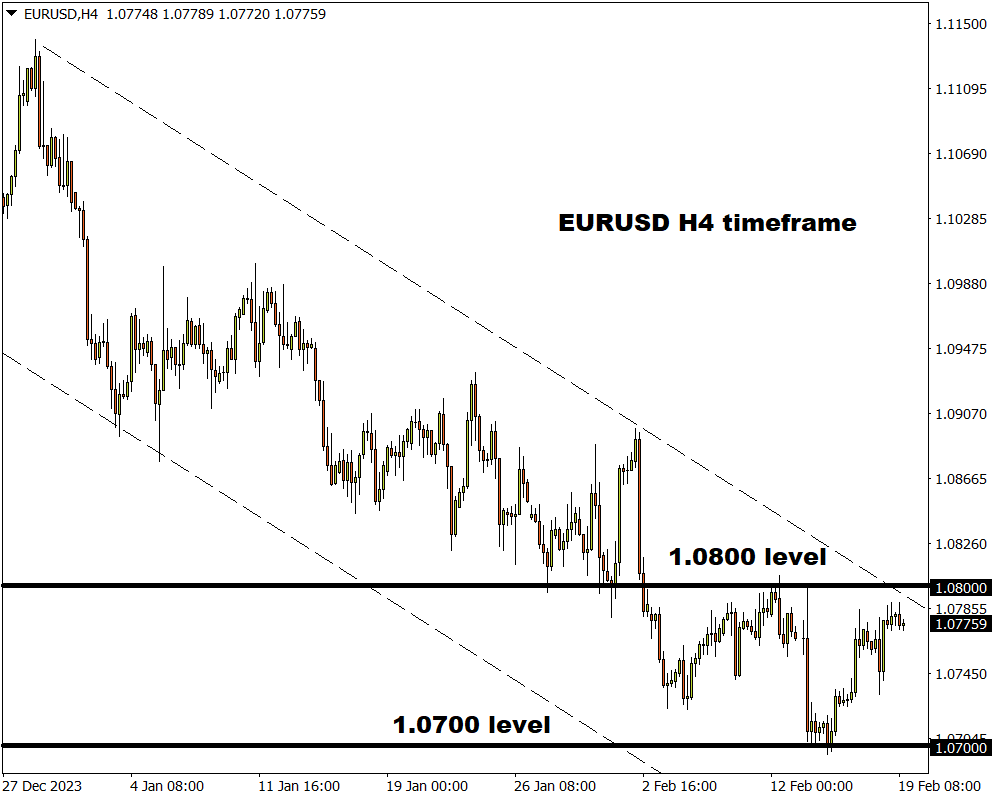 The trend is bearish on the H4/daily timeframe but bulls have put up a good fight with support at 1.0700 and resistance at 1.0800.