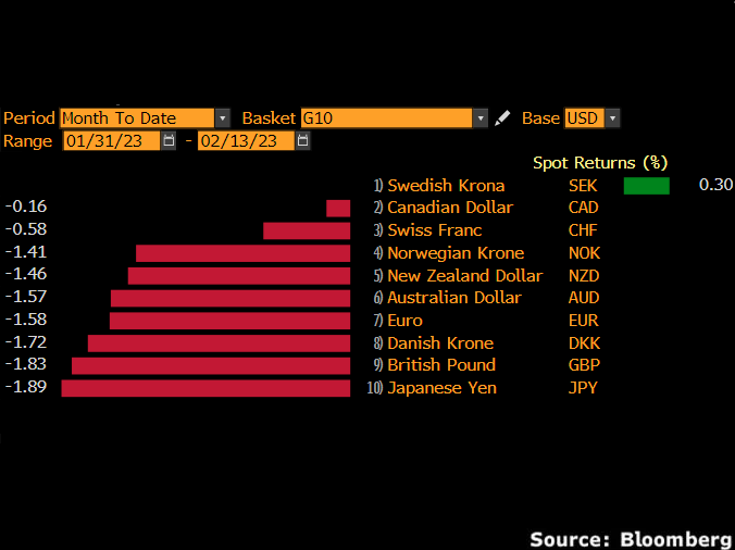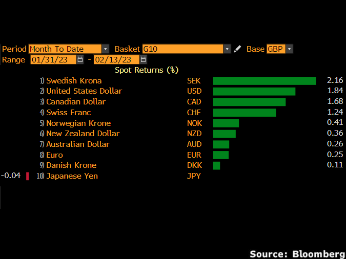Interestingly, the dollar straightened up – boosted by January’s robust jobs figures which revived market expectations around the Fed raising interest rates over a longer period.