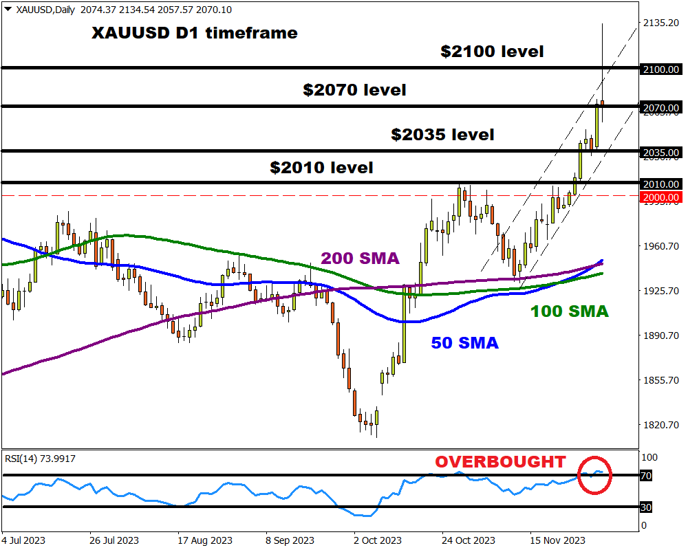 Despite the sharp pullback in prices, gold remains fundamentally bullish due to geopolitical risk and growing expectations for a US rate cut in 2024. Indeed, the precious metal is up roughly 15% since the October low and still trading a distance away from the psychological $2000 level.