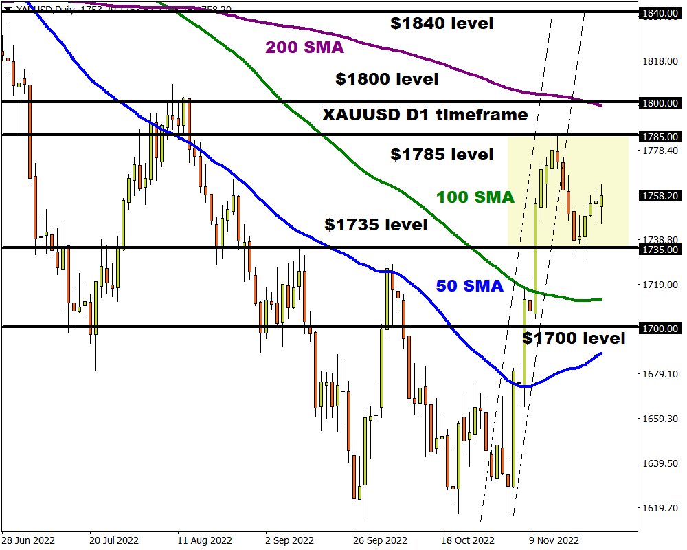 Bulls have already made a move on Monday thanks to geopolitical tensions and this momentum could roll over into the next trading session. It may be worth keeping an eye on speeches by New York Fed President John Williams, and St. Louis Fed President James Bullard. There is a lot going on mid-week with Fed Chair Jerome Powell under the spotlight. He is expected to reinforce expectations over the central bank slowing its pace of interest rate increases from December. Such a development may lead to a weaker dollar and falling Treasury yields – resulting in a boost for gold prices. Investors will also be presented with the Fed Beige Book report and US 3Q GDP second estimate which could result in some additional dollar volatility, spilling over to gold.