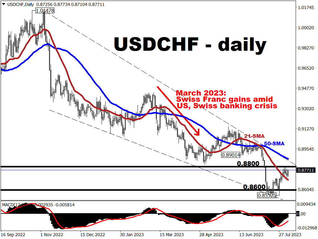 - A set of CPI numbers that show US inflation is moderating further, which in turn allows the Fed to back away from a September rate hike, may drag USDCHF lower on the weaker US dollar.