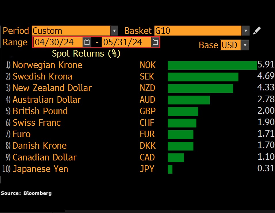 Interestingly, the dollar depreciated against every single G10 currency in May.