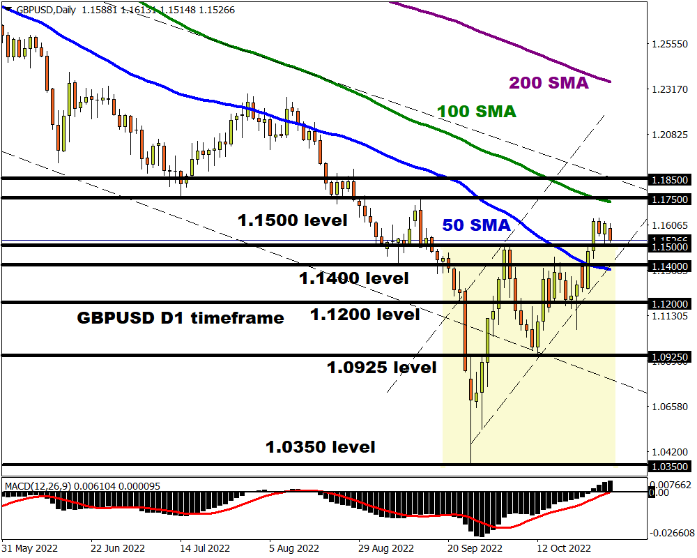Mid-week, the Federal Reserve is expected to raise interest rates by 75 basis points. Given how such a move has already been priced, much attention will be on the press conference for clues on future monetary policy. Should the central bank strike a cautious tone with doves entering the scene, this could weaken the dollar as aggressive rate hike bets cool. A weaker dollar may push the GBPUSD higher ahead of the BoE meeting on Thursday 3rd November.