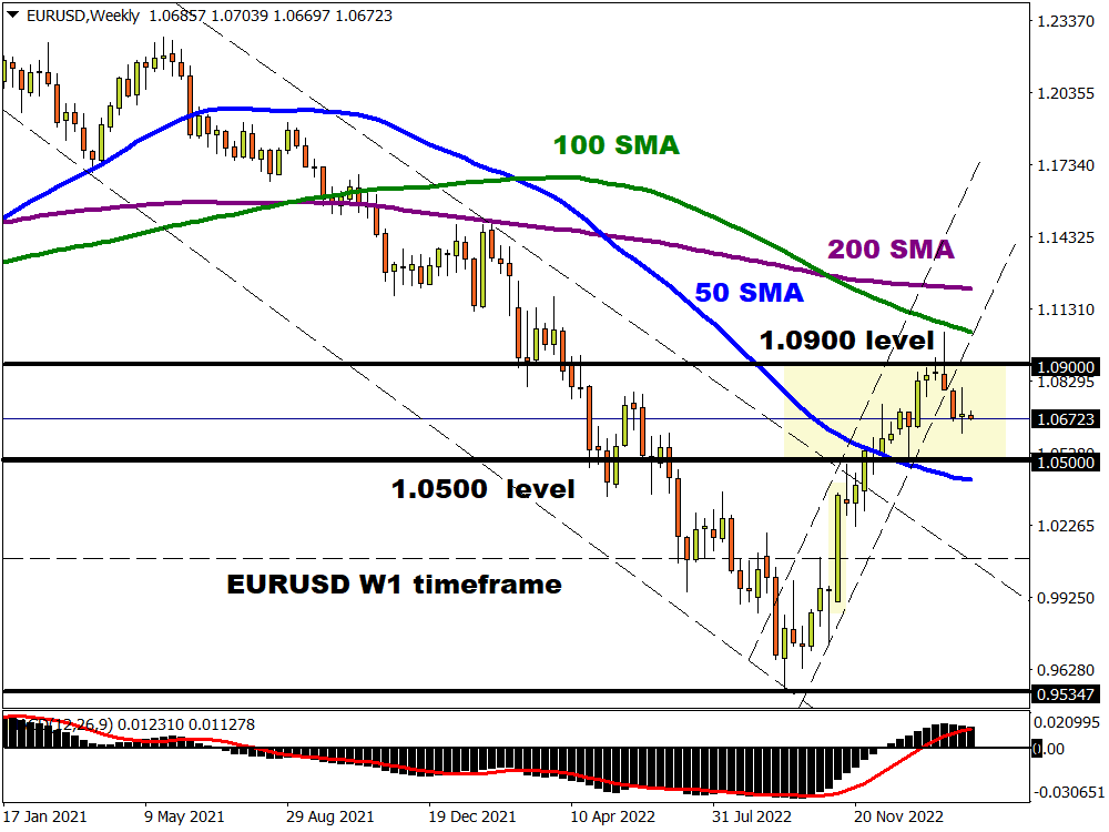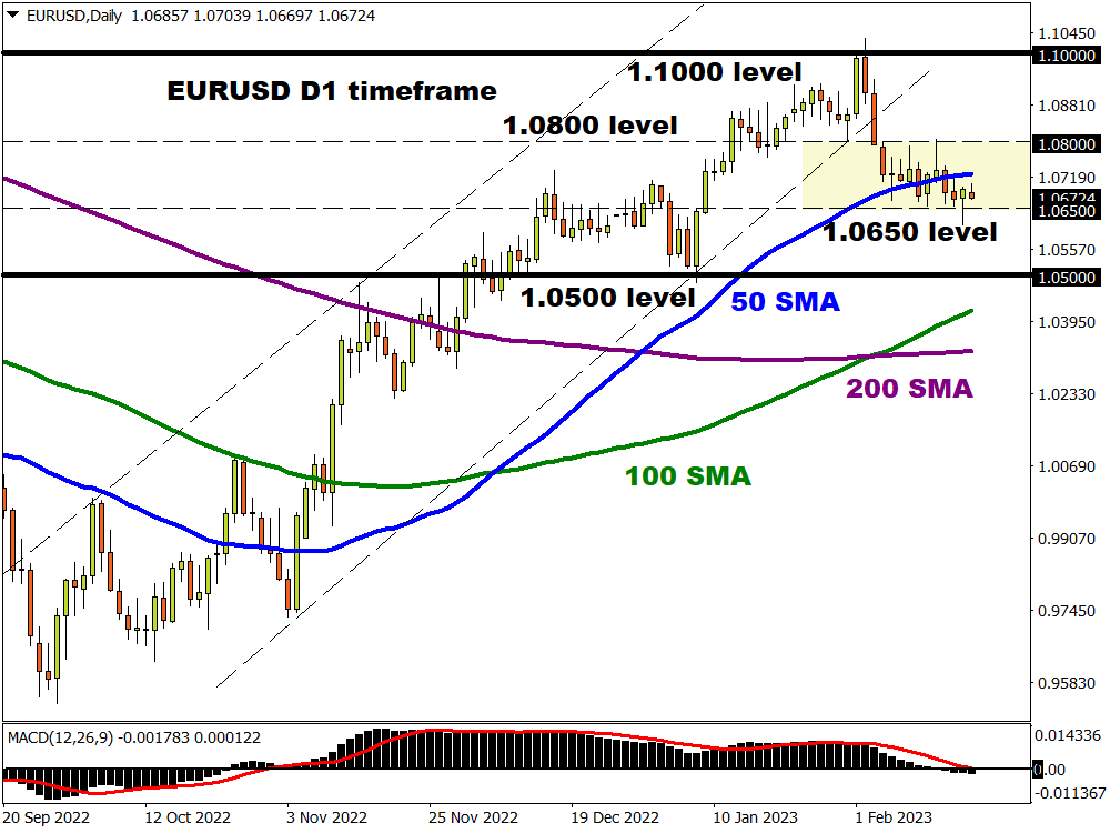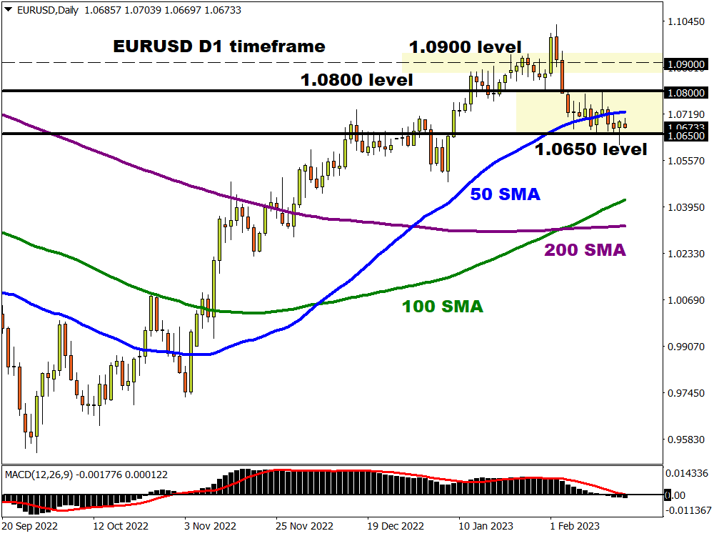 It is worth keeping in mind that the euro remains supported by ECB hike expectations and improving sentiment towards the Eurozone economy after GDP unexpectedly grew in the final quarter of 2022. On the other hand, despite the dollar’s recent boost – the bigger picture has not changed with the Fed closer to a peak in rates in the coming few months. Essentially, the narrowing monetary policy divergence between the ECB & Fed suggests that the EURUSD is fundamentally bullish.