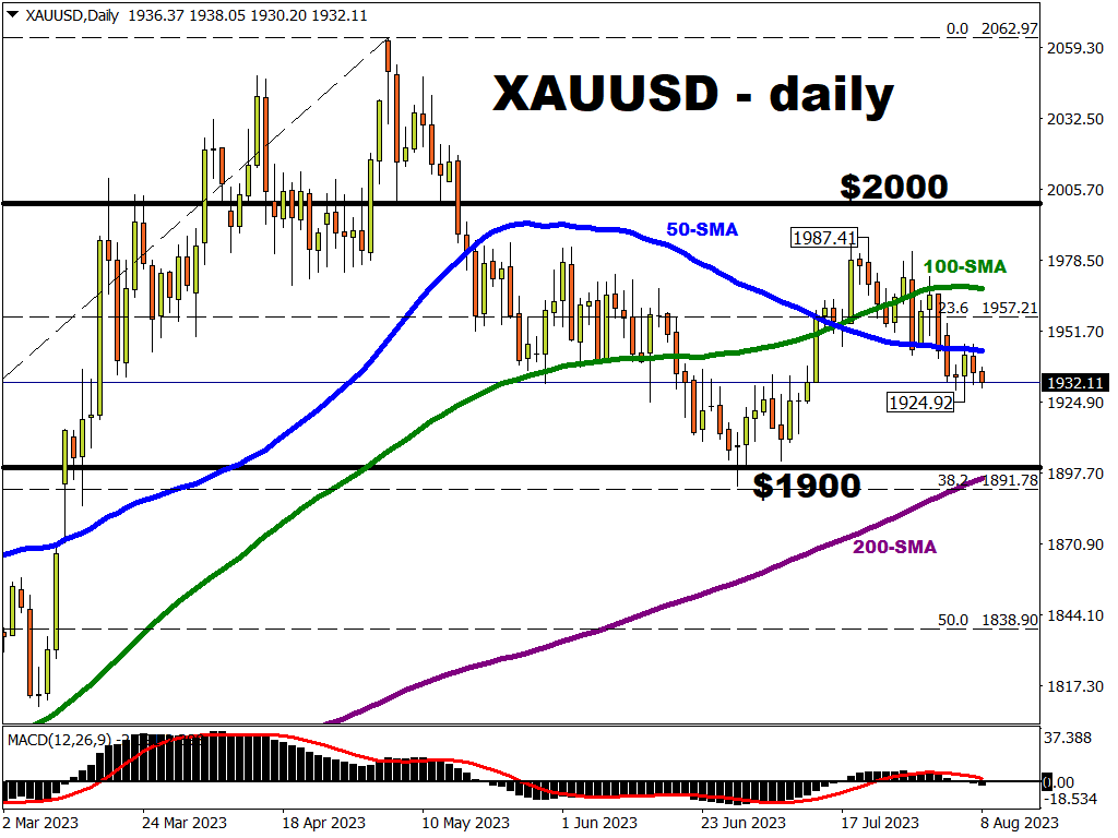 If we lose this level, prices look likely to fall below $1920 with $1900 and the June low in focus, resting above the 38.2% Fibonacci level, with the 200-day simple moving average (SMA) also thrown into the mix to potentially offer support.