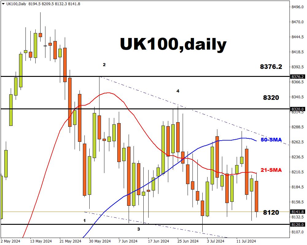 Technically speaking, UK100, daily is seen consolidating into a falling wedge pattern, (a sideways movement in price bounded by two downward-sloping converging lines).