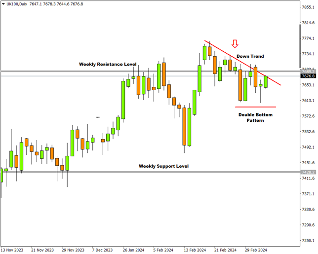 The FTSE 100 Index (UK100) on the daily time frame made a double bottom and this might signal the end of the current down trend. There is a strong weekly resistance level that will need to be broken though, and this remains to be seen.