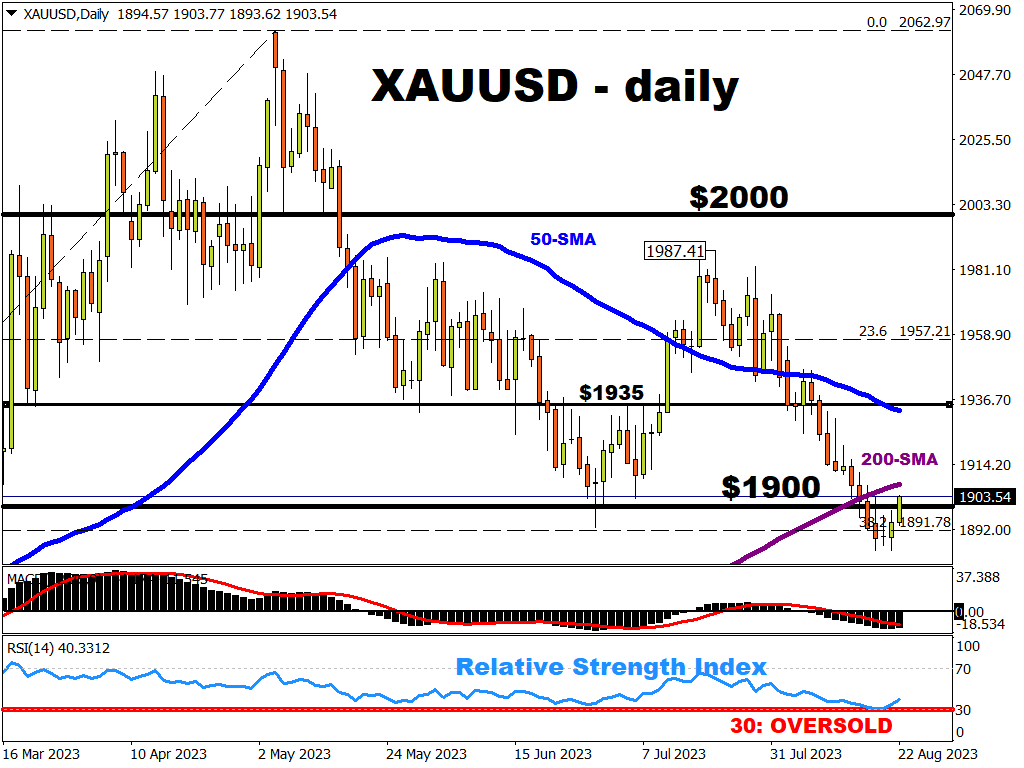 The yellow metal still currently trades below the 200-day simple moving average (SMA), though has resurfaced above the psychologically-important $1900 level for the time being.