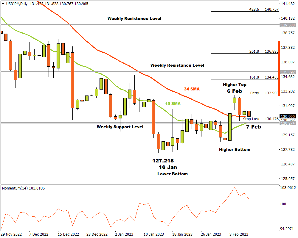 After the bottom at 127.218, the currency pair broke through the 15 and 34 Simple Moving Averages and the Momentum Oscillator pierced the 100 baseline into bullish territory. A higher bottom that formed in the process also confirmed the change in market structure.