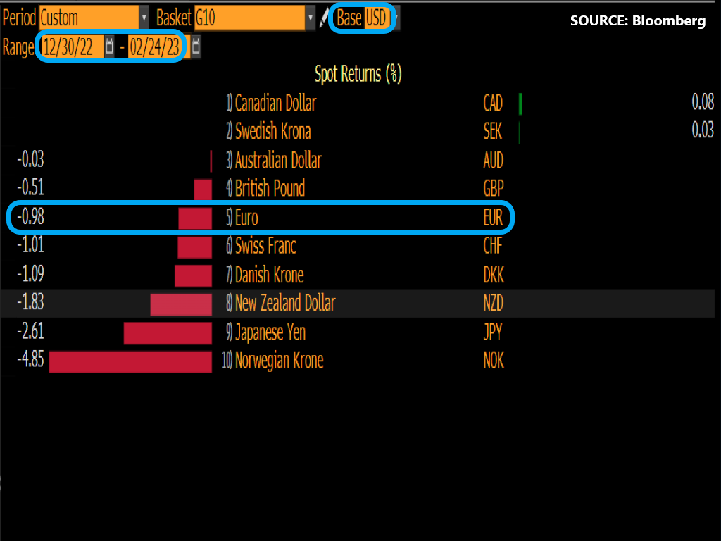 Hence, if we are presented with fresh evidence on March 2nd of stubborn Eurozone inflation (say, a number that isn’t noticeably lower than January’s 8.6%), that could help the euro unwind its near-1% of year-to-date declines against the resurgent US dollar.