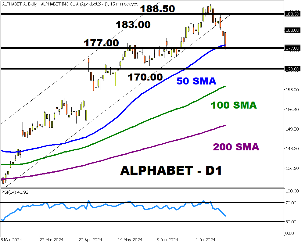 Talking technicals, Alphabet stocks have shed roughly 6% this week with prices wobbling above the 50-day SMA. The past few days have been rough for tech stocks due to reports of the US mulling tougher restrictions on trading chips with China.
