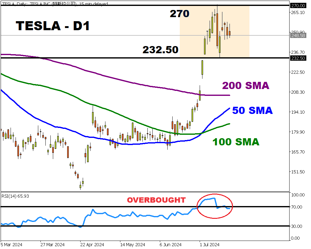 Looking at the technical picture, Tesla stocks remain in a wide range on the daily charts with support at $232.50 and resistance at $270. Given the potential 8% move either up or down, a breakout could be on the horizon.