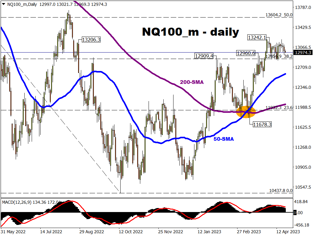 On the other hand, a disappointing earnings season out of Big Tech next week, followed by still-hawkish signals out of the Fed in early May, would likely undo some of the NQ100_m’s year-to-date gains.