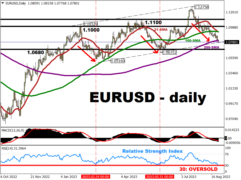 The 14-day relative strength index (RSI) for the world’s most-traded FX pair is now flirting with the 30 mark, which denotes oversold levels.