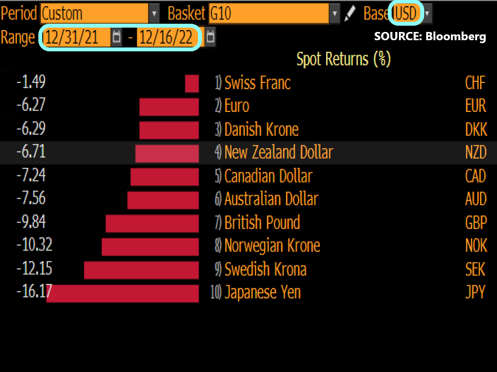 Note how the Japanese Yen remains the worst-performing G10 currency versus the US dollar in 2022, despite recovering by some 10% since weakening to almost 152 against the greenback back in October.