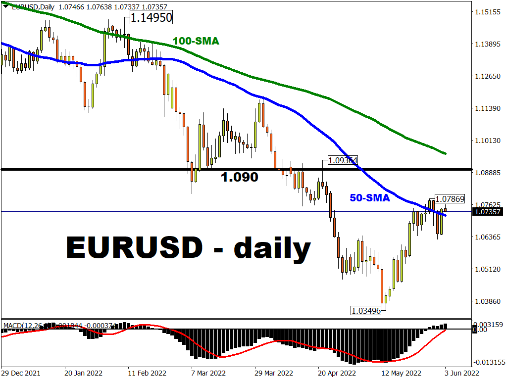 If so, euro bulls are likely to eye the 1.09 mark, while also potentially solidifying the pair's 50-day simple moving average as a key support level.